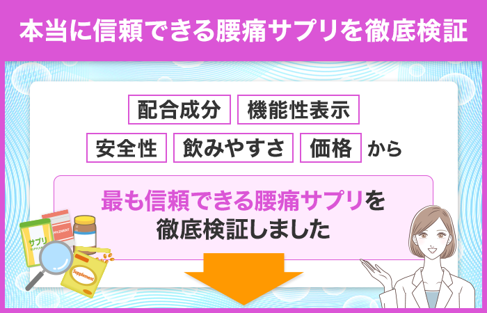 成分や飲みやすさ、価格、特徴を徹底検証して厳選した腰痛サプリなので、ぜひ参考にしてみてください!