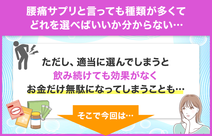 とはいえ、腰痛サプリは種類も多く、本当に効果があるのかどうか、どれを選べばいいのか迷ってしまいますよね…。