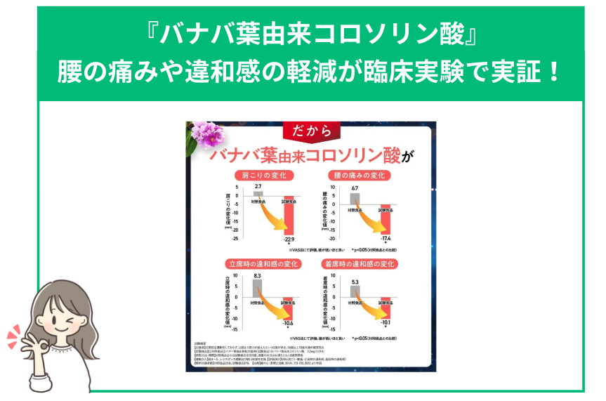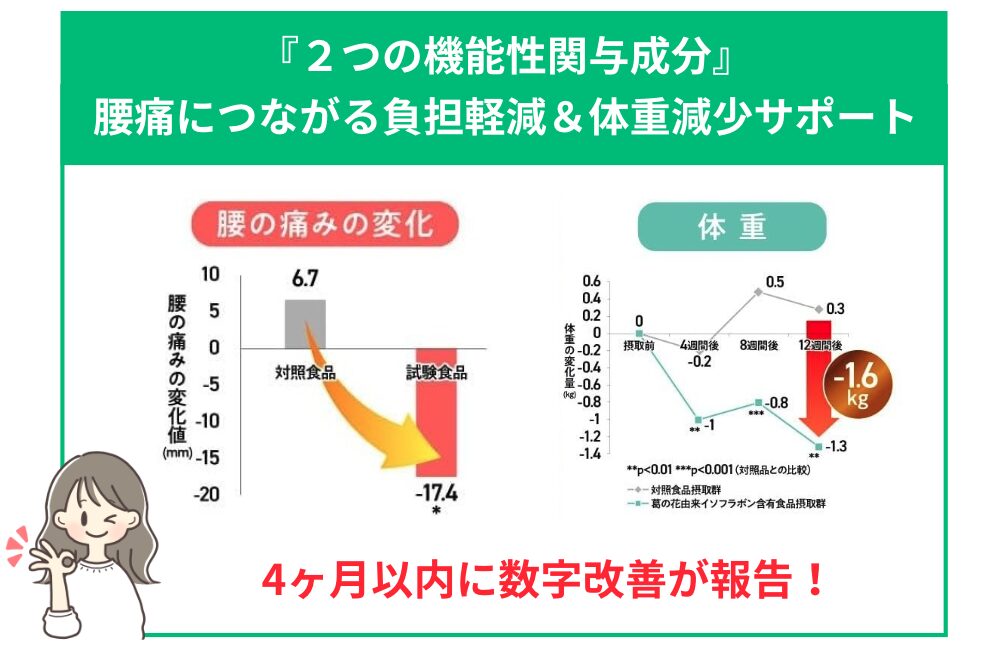 この2つの成分は腰痛につながる負担を軽減していく重要な成分で、筋力の増加や維持、体重を減らすサポートをしてくれる嬉しい成分です。(臨床試験でも効果実証済み)