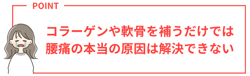 例えば、腰痛ではよくコラーゲンや軟骨不足が指摘されますが、それらを補う栄養を摂取するだけでは、腰痛の原因を取り除いたことにはなりません。