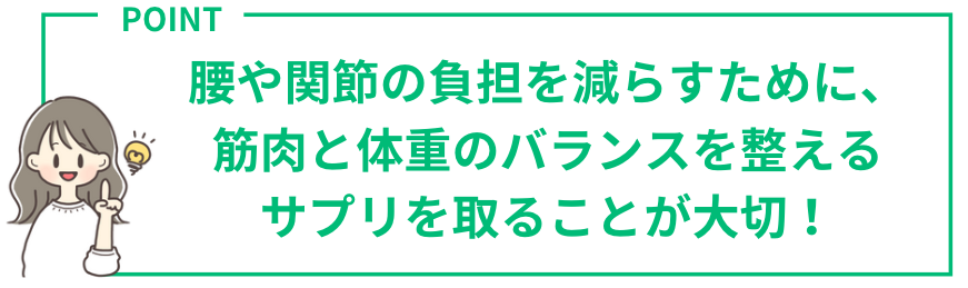 それよりもまずは、身体の構造をもとに腰や関節に負担をかけないように、筋肉量や体重のコントロールにつながるサプリを摂ることが何よりも大切です。