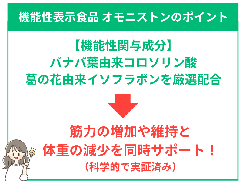 オモニストン』の一番の特徴は、バナバ葉由来コロソリン酸と葛の花由来イソフラボンという2つの機能性関与成分を配合していること。